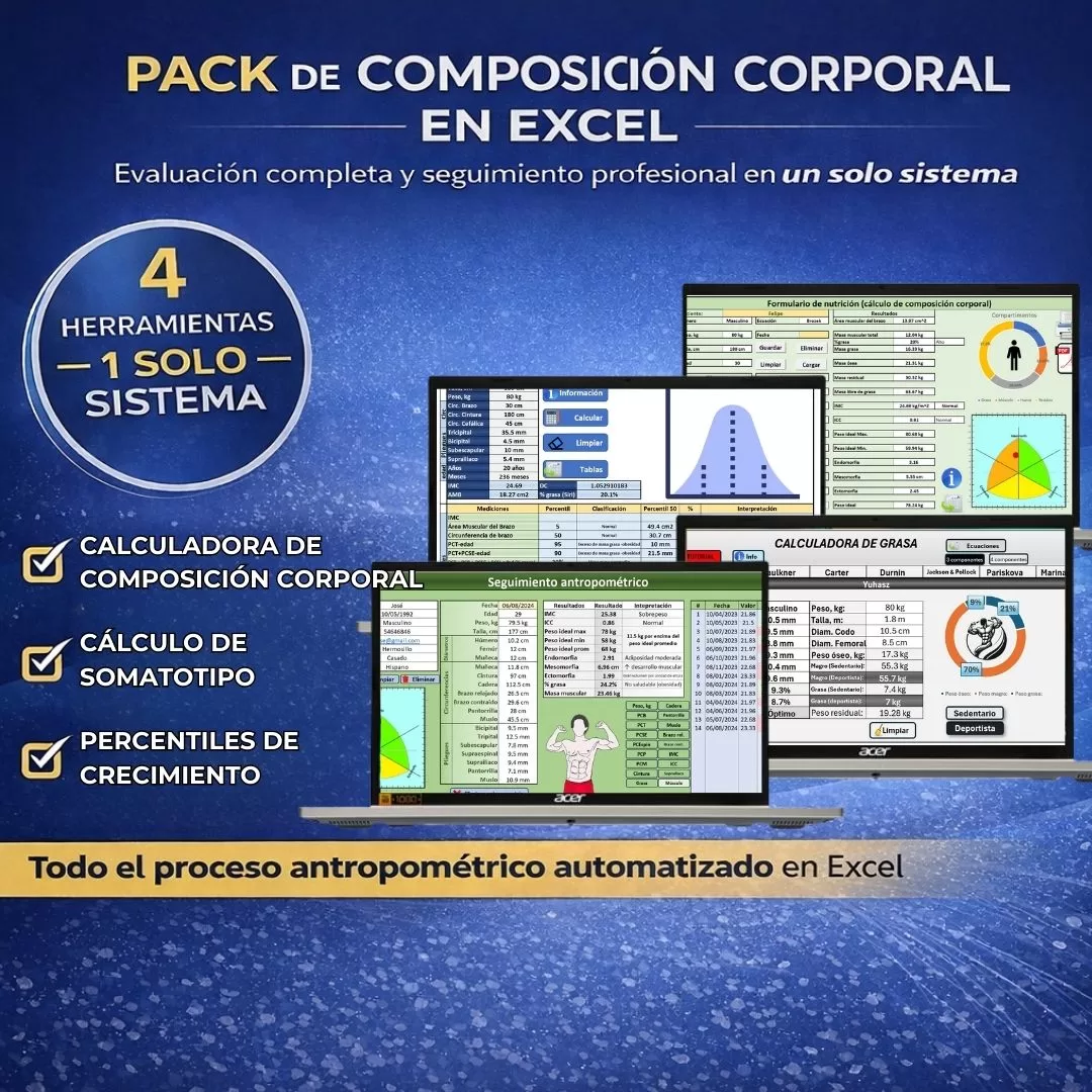 Este pack reúne 4 herramientas especializadas que trabajan de forma complementaria, permitiéndote evaluar, registrar, interpretar y dar seguimiento a la composición corporal de tus pacientes de manera rápida, precisa y estandarizada.
