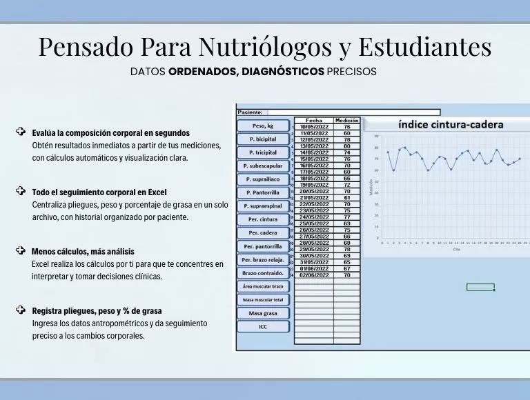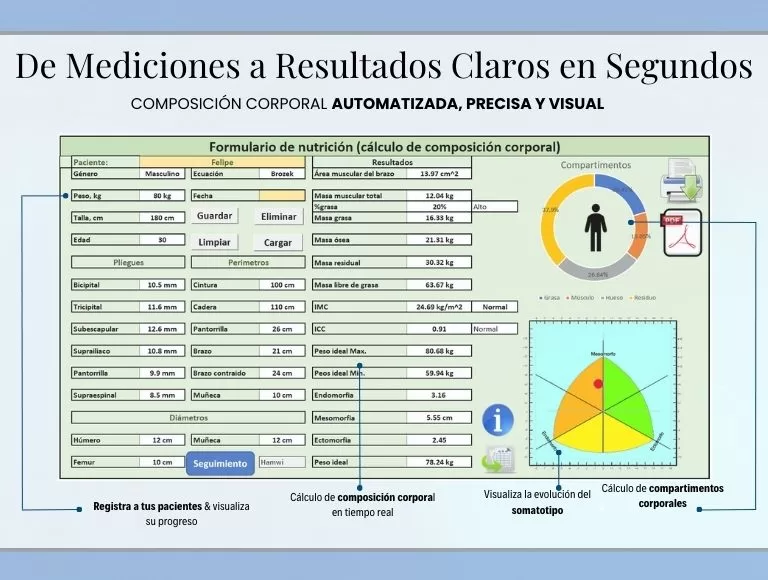 Lleva tu evaluación nutricional a un nivel clínico y profesional con un sistema completo de composición corporal y seguimiento antropométrico, diseñado para nutriólogos, estudiantes y profesionales de la salud.